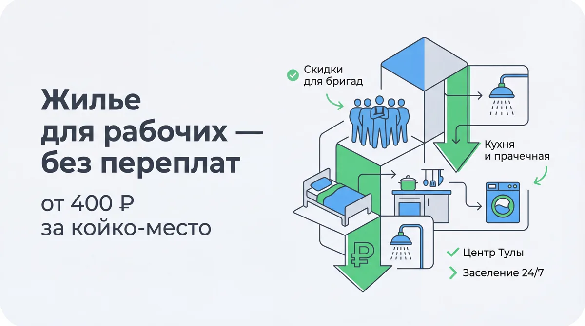Строительная бригада или вахтовая смена — размещение в хостеле «Мягко и точка» обойдётся от 400 рублей за койко-место в сутки. При заселении группой от 5 человек на срок от 7 суток предусмотрены дополнительные скидки. Экономия ощутима: полноценная кухня позволяет готовить самостоятельно, а прачечная избавляет от необходимости везти лишние вещи.