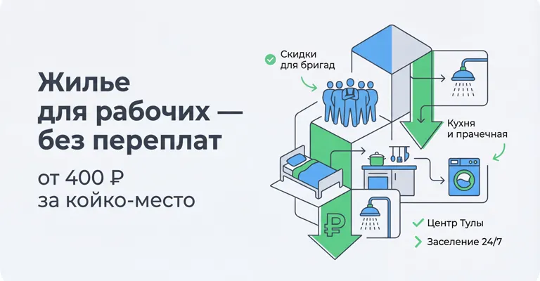 Для организаций предоставляем полный комплект документов: кассовый чек, акт выполненных работ, счёт на оплату. Принимаем наличные, банковские карты и безналичный расчёт для юридических лиц. Заселение круглосуточное — даже если бригада приехала ночью после дороги, администратор встретит и разместит всех.