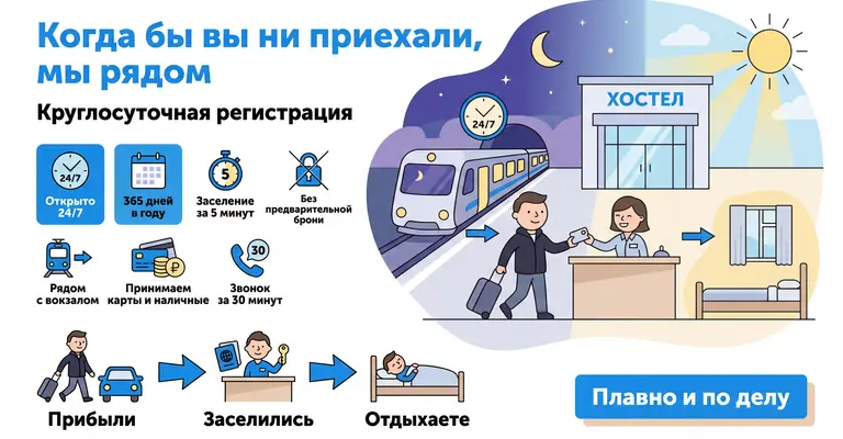 Trains from Moscow, Saint Petersburg, and Voronezh often arrive in Tula late at night or early in the morning. No need to sit at the train station until morning — just call and come over. We will check you in at any time, the hostel is 5 km from the station.