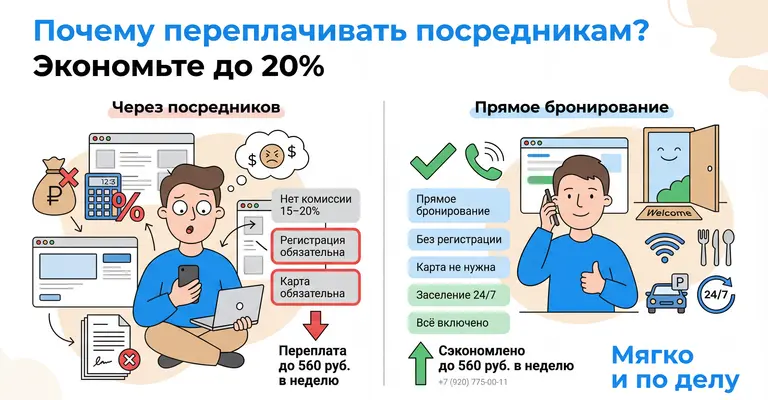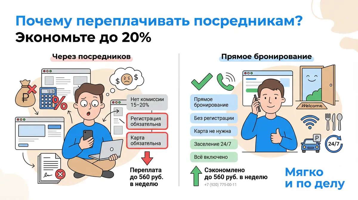Aggregators like Ostrovok and Yandex.Travel charge 15-20% commission. At a rate of 400₽/night, you overpay 60-80₽ per day. Over a week — up to 560₽. By booking directly, you pay the actual cost with no markups.