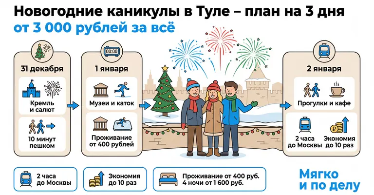 4 nights at the hostel — from 1,600₽. For comparison: Tula hotels on New Year — from 8,000-15,000₽ per night. Lastochka round trip — from 1,200₽. Total New Year holidays — from 3,000₽ per person. Stay in the center, 800 m from the Kremlin and fireworks.