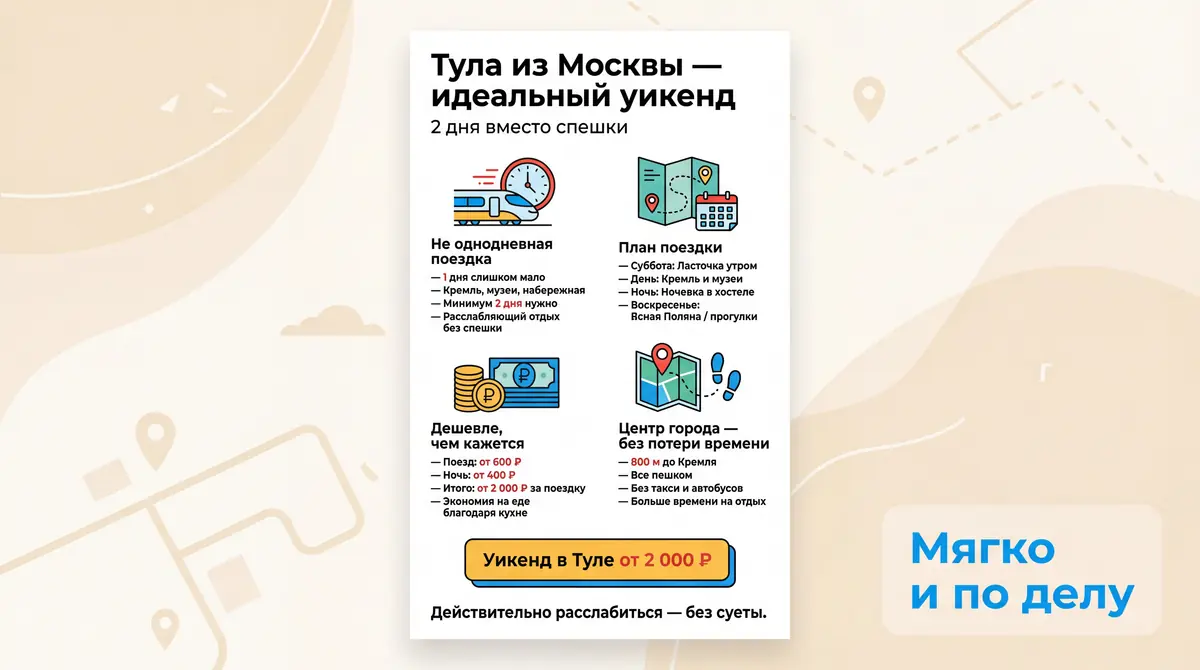 Многие москвичи едут в Тулу на один день и не успевают ничего. Кремль, музей оружия, набережная, пряники — на всё нужно минимум два дня. Утренняя Ласточка в субботу, ночёвка в хостеле, воскресенье — Ясная Поляна или второй круг по музеям. Вечером — обратно в Москву. Полноценный отдых, а не забег.
