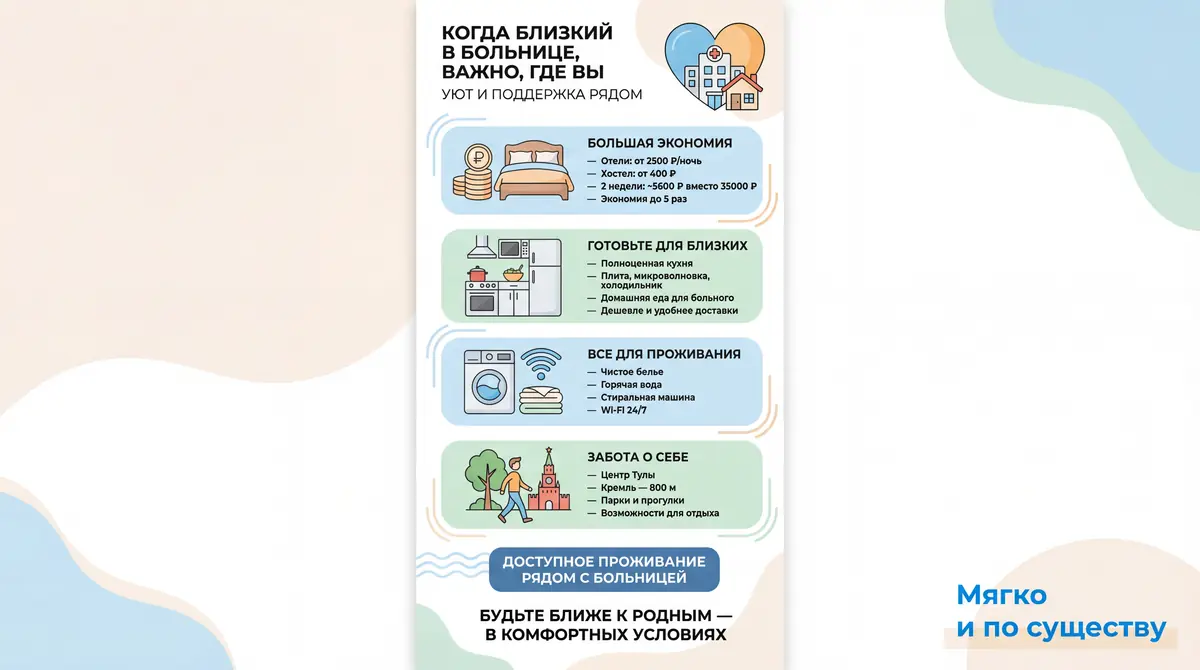 Гостиницы рядом с больницей Ваныкина — от 2500₽ за ночь. Если родственник лежит неделю-две, это 17 000–35 000₽ только на жильё. Хостел — от 400₽/сутки, за две недели — около 5600₽. Разница — в 5 раз. При этом есть кухня, Wi-Fi, стиральная машина, горячая вода. Деньги лучше потратить на лекарства и восстановление.