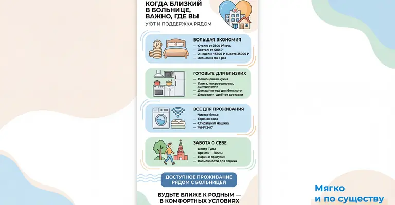 Пока близкий на лечении — не замыкайтесь. Хостел в центре Тулы: кремль 800 метров, парки, музеи, кафе. Погуляйте после визита в больницу, отвлекитесь, восстановите силы. Wi-Fi для удалённой работы, тихая обстановка для отдыха. Вы заботитесь о близком — но позаботьтесь и о себе.