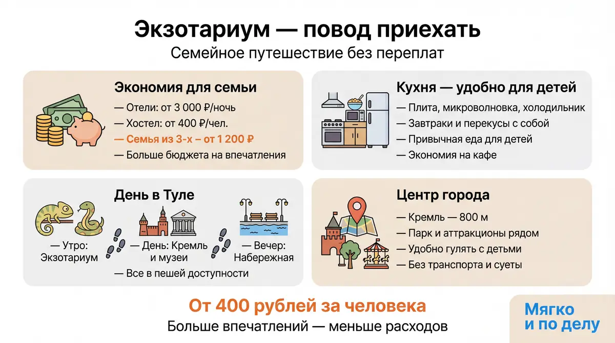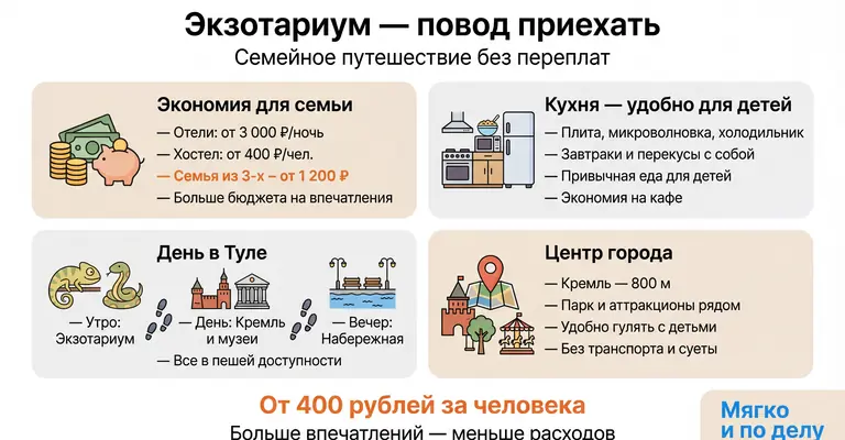 Тульский экзотариум — один из крупнейших в России. Билеты, еда, сувениры — расходы складываются. Гостиница на семью — от 3000₽ за ночь. Хостел — от 400₽ на человека. Семья из трёх — от 1200₽. Сэкономленное — на впечатления: музей оружия, кремль, пряничная фабрика. Поездка в Тулу станет ярче, а не дороже.