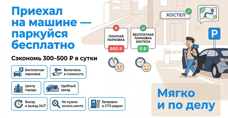 Платная парковка в центре Тулы — 40-60₽/час, за сутки набегает 300-500₽. За неделю — 2 000-3 500₽ только за стоянку. У нас парковка бесплатная и входит в стоимость проживания от 400₽/сутки.