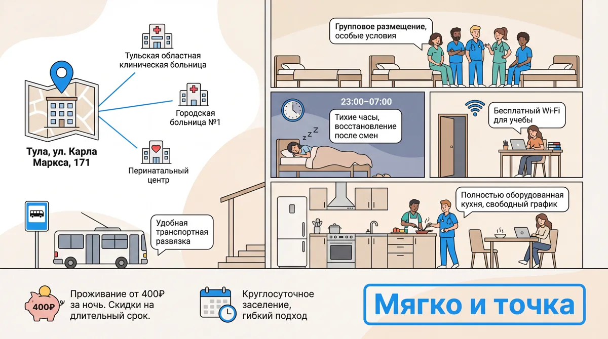 床位每晚400卢布起 — 比租房或酒店便宜数倍。长期入住可享折扣。全天候办理入住,灵活安排 — 我们理解医务人员的非标准工作时间。