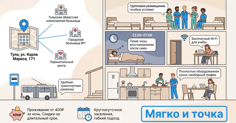 旅馆"Myagko i Tochka"位于图拉市中心卡尔-马克思街171号。交通便利,可轻松到达图拉州立临床医院、市第一医院、围产期中心和其他医疗机构。5人以上团体入住可享特别优惠。