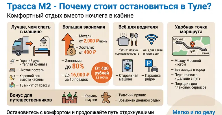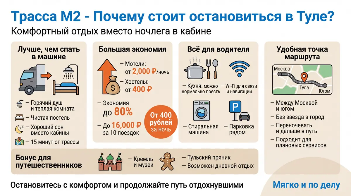 M2公路连接莫斯科与南方——途中数百公里没有像样的住宿。睡在驾驶室不舒服、不安全,冬天更是寒冷难耐。图拉旅舍——热水淋浴、干净床铺、温暖房间。距公路仅15分钟。好好睡一觉,第二天精神饱满继续上路。身体会感谢你的。