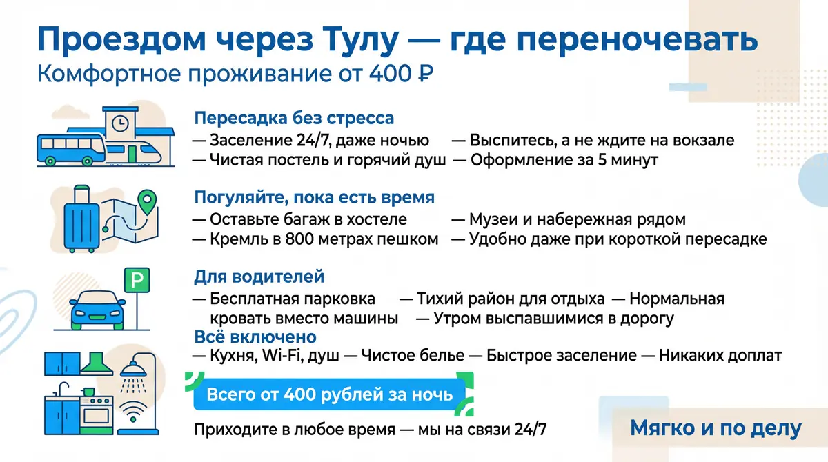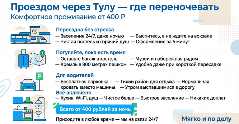 途经图拉的班次经常需要长时间等待换乘。在车站过夜——既睡不好也无法休息。只需400₽,您就能享有干净的床铺、热水淋浴和良好的睡眠。早上在厨房吃早餐,精力充沛地出发。全天候随时入住,即使凌晨3点也可以。提前半小时来电——一切准备就绪。