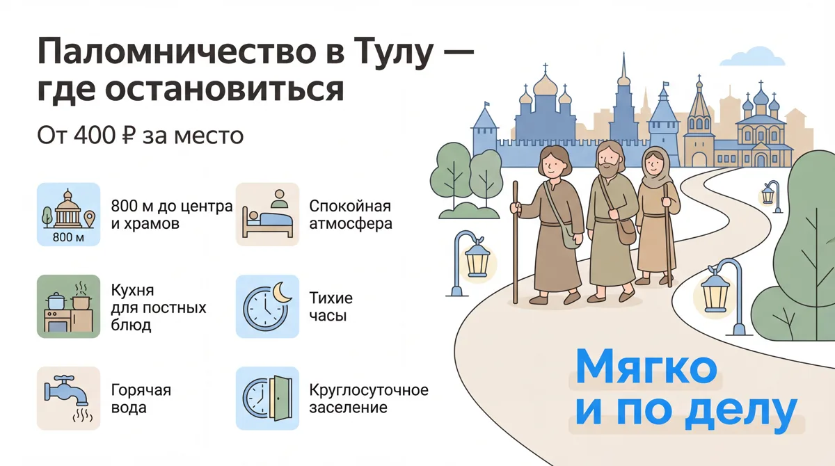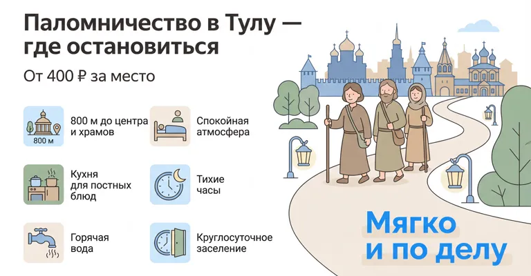 床位每晚400卢布起,比酒店便宜数倍。入住7天以上可享折扣。全天候办理入住,无论是晚间礼拜后还是清晨到达都可以。管理员24小时在岗,随时协助安排入住。